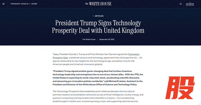 随后,特朗普和斯塔默签署了一项《科技繁荣协议》,共同努力开发用于医疗保健的人工智能模型,扩大量子计算能力,简化民用核项目。